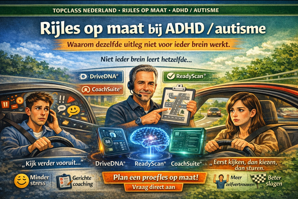Ontdek waarom standaard rijles niet voor ieder brein werkt. TopClass Nederland biedt rijles op maat bij ADHD en autisme met DriveDNA®, ReadyScan® en gerichte neurocoaching.